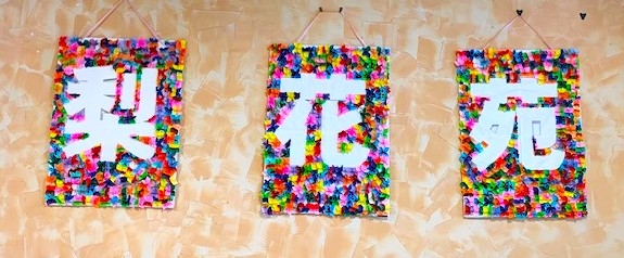 6月より9月までの間、近隣の大学生総勢12名が介護等体験で来苑しました。大学生12名のリレー形式で入居者さんと一緒に壁飾りを作成することになり、折り紙でのパーツ作りから始めました。折る、ホチキスで止める、開く、などの指先の動作で脳の活性化にもなります。大学生と入居者さんの四か月に及ぶ頑張りで、約1000個のパーツが出来上がり立派な壁飾りが完成しました♪